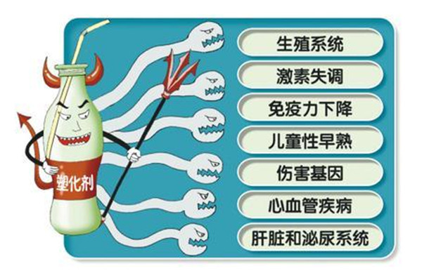 联苯酚A(Bisphenol):有雌性荷尔蒙化学物质反应,乳腺癌细胞呈异常增殖;邻苯二甲酸酯(DEHP,BBP,DBP):对精巢具有毒性;肝脏癌细胞呈异常增殖;聚乙烯(Polystyrene):引起妇女体内荷尔蒙增加;聚氯联苯(PCB):环境荷尔蒙的主要成员,燃烧以后产生二恶英。